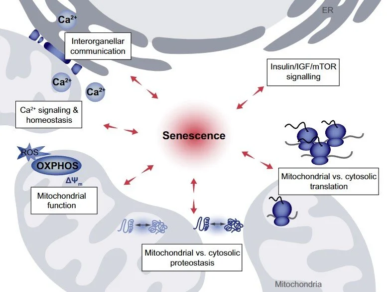 Human aging is a complex process driving the progressive decline of homeostasis and regenerative potential of tissues. Senescent cells accumulate and compromise the function of organs, contributing to various age-related diseases. Disturbed mitochondrial function, inter-organelle communication, proteostasis and metabolic control lead to senescence-associated dysfunctions. However, the underlying mechanisms are still largely unexplored.